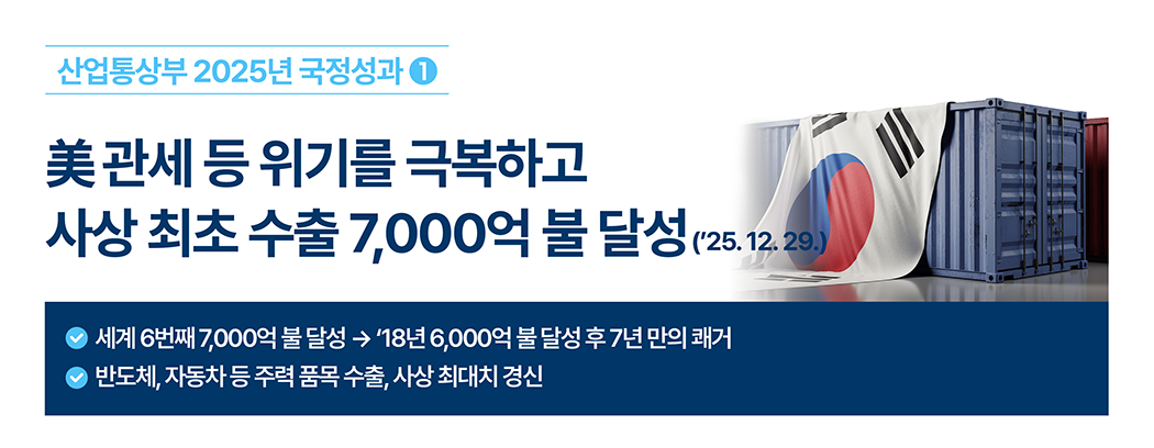 美 관세 등 위기를 극복하고 사상 최초 수출 7,000억불 달성(’25.12.29)- 세계 6번째 7,000억불 달성 →‘18년 6,000억불 달성후 7년만의 쾌거