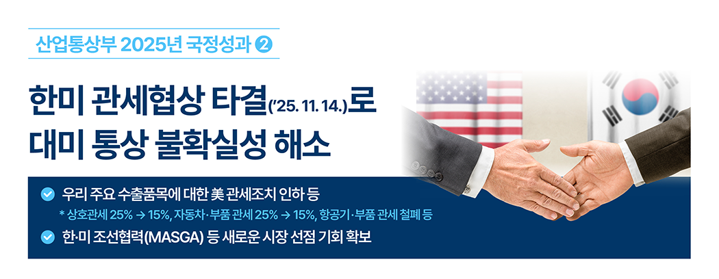 한미 관세협상 타결(’25.11.14)로 대미 통상 불확실성 해소- 우리 주요 수출품목에 대한 美 관세조치 인하 등
