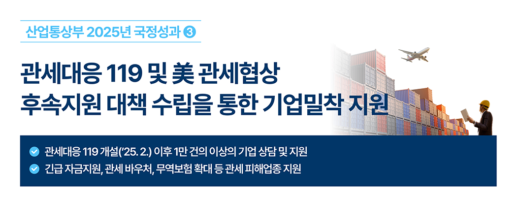관세대응 119 및 미 관세협상 후속지원 대책 수립을 통한 기업밀착 지원- 관세대응 119 개설(’25년 2월) 이후 10,570건의 기업 상담 및 지원